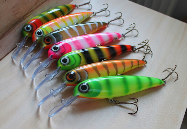 tuli rekisteröityä tänne kalassa. nettiin niin ajattelin pistää myös muutaman kuvan omatekoiseen runkoon tehtyjä taimenvaappuja. olen aloittanut vaappujen teon tänä syksynä, niin alottelin yksinkertaisilla värityksillä. nuo tarrasilmät ei ole hyviä kun tahtovat lakatessa vähän nousta jostain nurkasta, vaikka kuinka painelee hyvin kiinni. täytyy varmaan ruveta maalaamaan nekin.