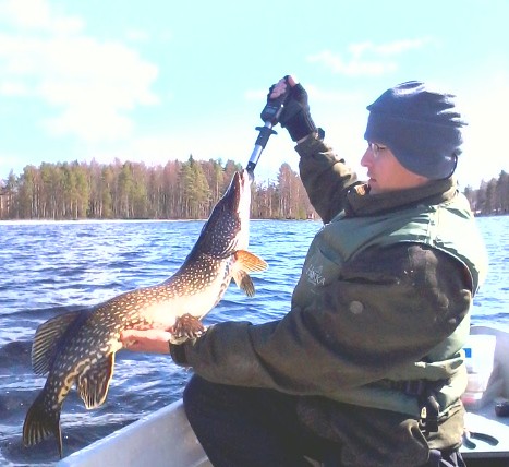 Syönti tuntu olevan tosi rauhallista, joten vene rantaan, notski pystyyn ja makkaran paistoon. Taktiikkaa hiottiin huippuunsa siinä tulistellessa ja heti kun saatiin siimat oikastua, kilopulikka pamautti vaappuun. Vartti etiäpäin ja tärppi toiselta puolelta, kalat selvästi aktiivisempia. Seuraava kala taivutti vapaa jo tärpistä kunnolla, pitkiä potkuja ja pinnassa kuohahti kohta paksumpi selkä. SIELLÄ se kauden eka suurhauki on nyt kiinni! Kala tuli suht nätisti veneen vierelle ja pienten puljausten jälkeen lopulta turvallisesti kyytinkin.